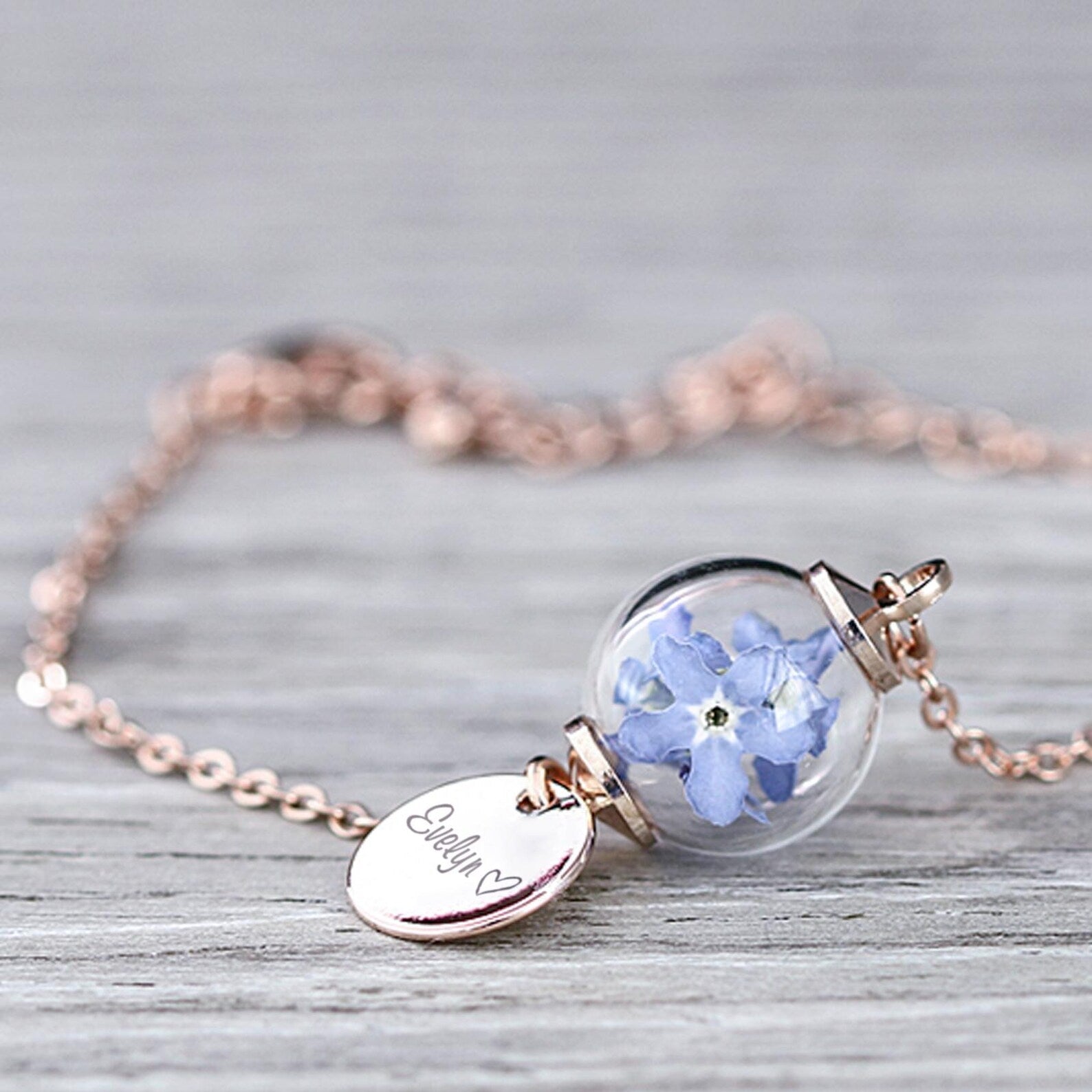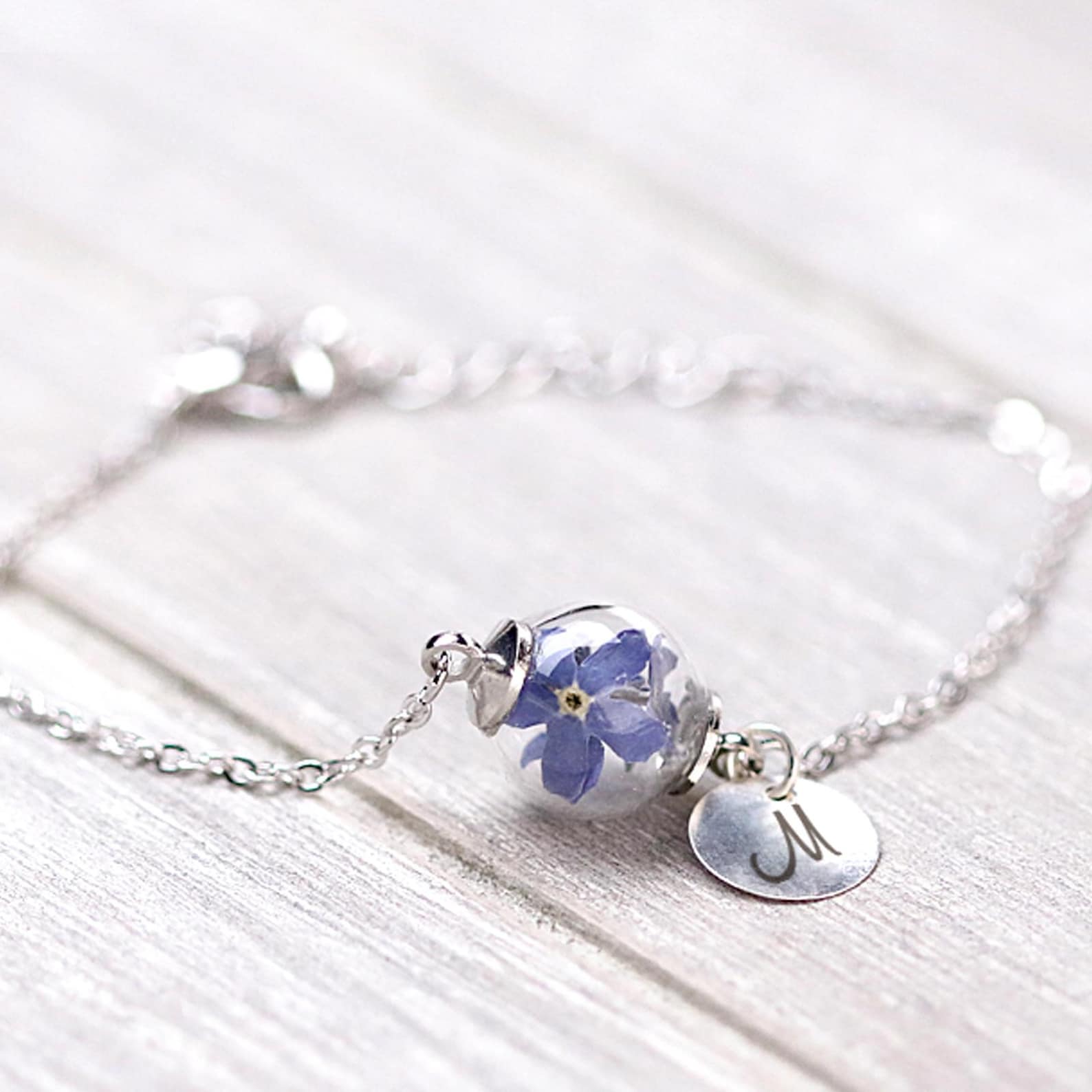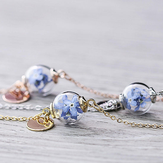 Ръчно изработена гривна с миниатюрна стъклена сфера, пълна с истински изсушен цвят "Не ме забравяй" от нашата градина. Допълнена с гравиран медальон по твой избор, тази гривна е уникално бижу, което носи спомен, емоция и смисъл.