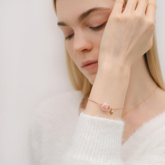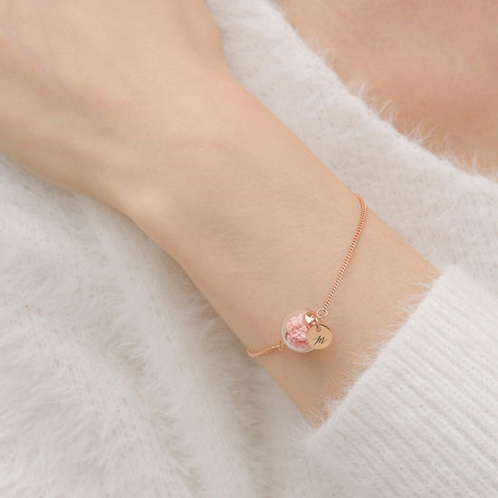 A delicate and emotional bracelet with a hand-dried Forget Me Not flower, enclosed in a glass sphere. The flowers are grown in our own garden, making each piece unique and inimitable . The personalized engraved locket adds sentimental value and makes the bracelet a special gift for yourself or a loved one.