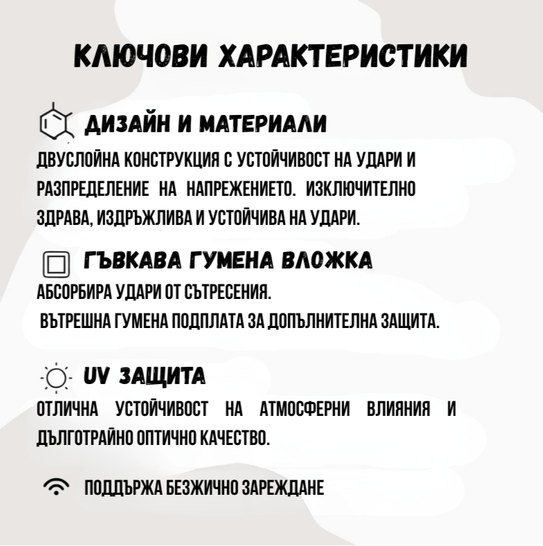 - Материал: Гъвкав TPU (Термопластичен полиуретан)