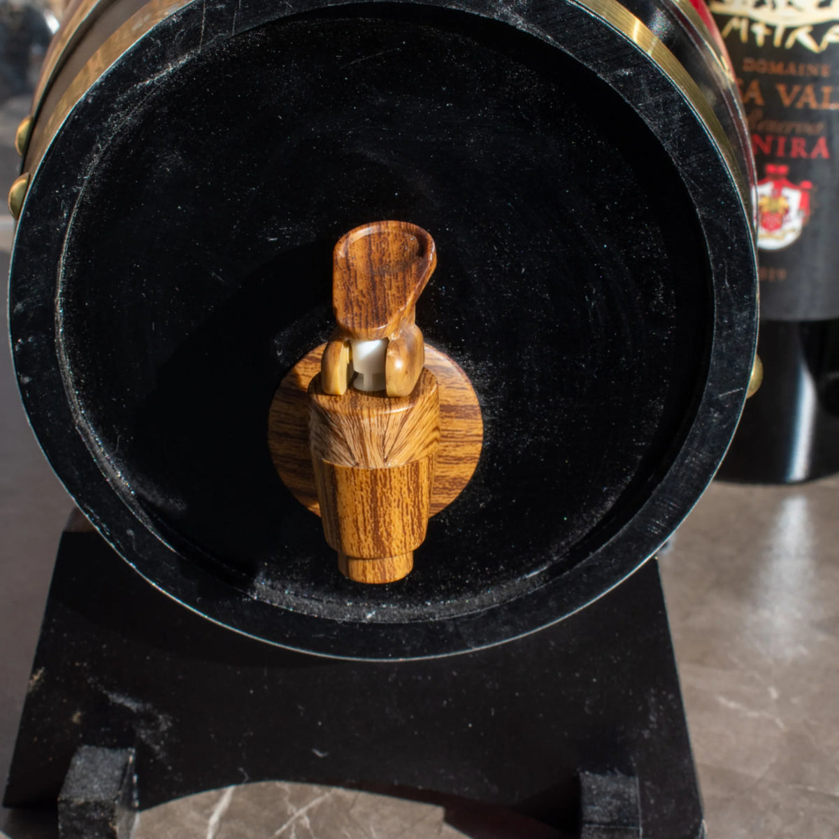 Белият дъб е избран заради своята здравина и способността му да подсилва аромата на течностите. Натуралното дърво е фино обработено, за да запази своята устойчивост и автентичен винтидж облик. С вместимост от 1.5 литра, тя е идеалният баланс между практичност и стилно присъствие, осигурявайки дълготрайност и премиум качество.