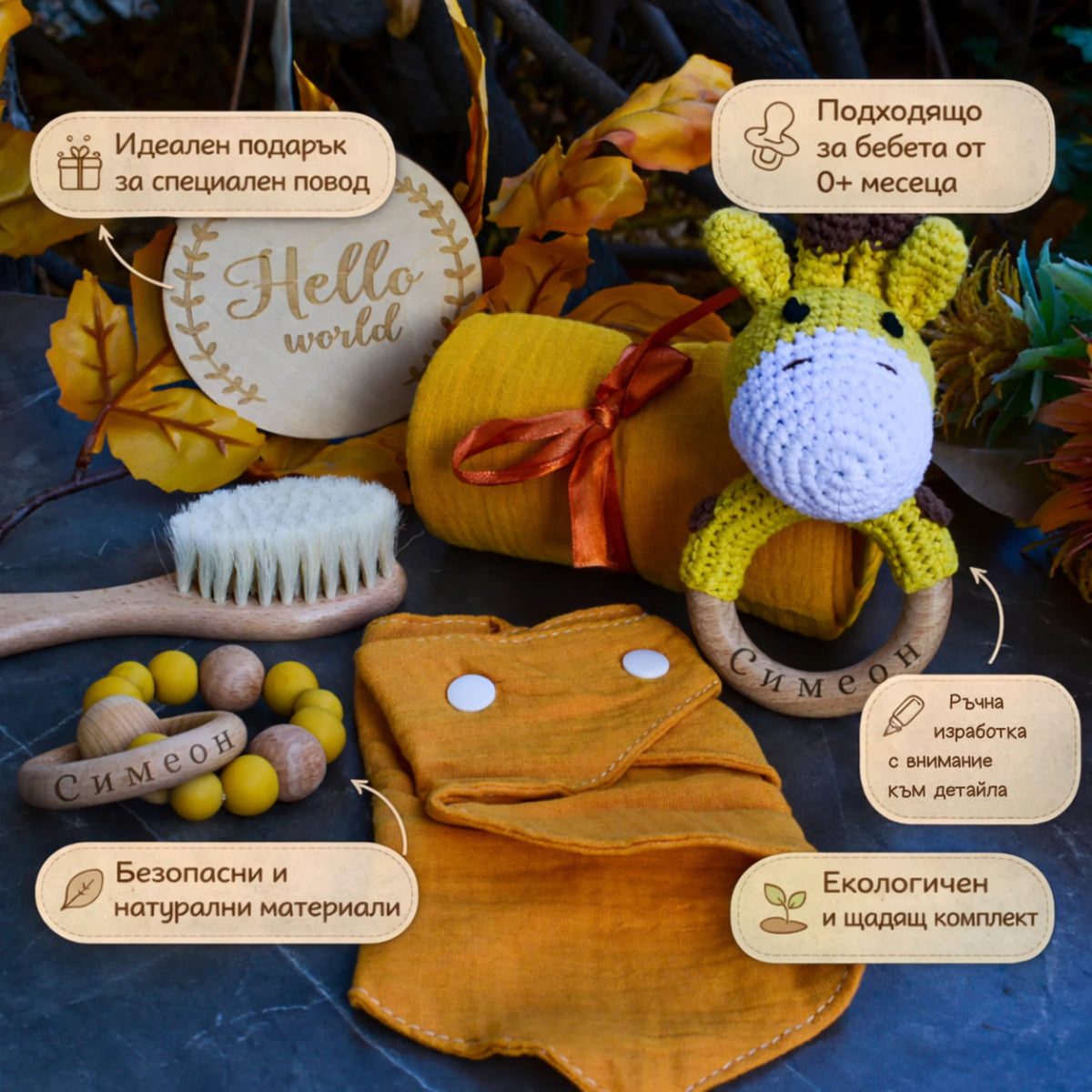 Превърнете този комплект в ценна семейна реликвия чрез лазерно гравиране. Името на бебето върху дървените елементи – от четката с естествен косъм до дървената дранкулка – добавя емоционална стойност, която превръща подаръка в уникален символ на неговото посрещане в света.