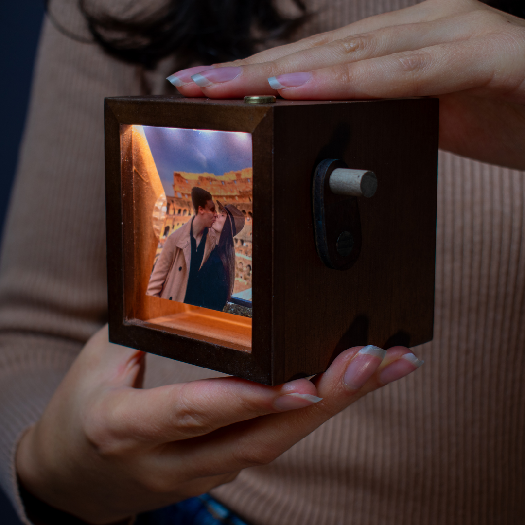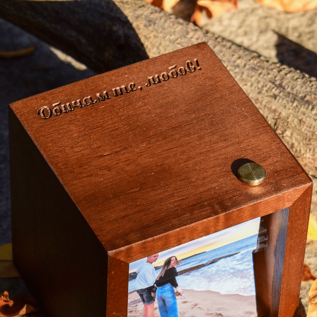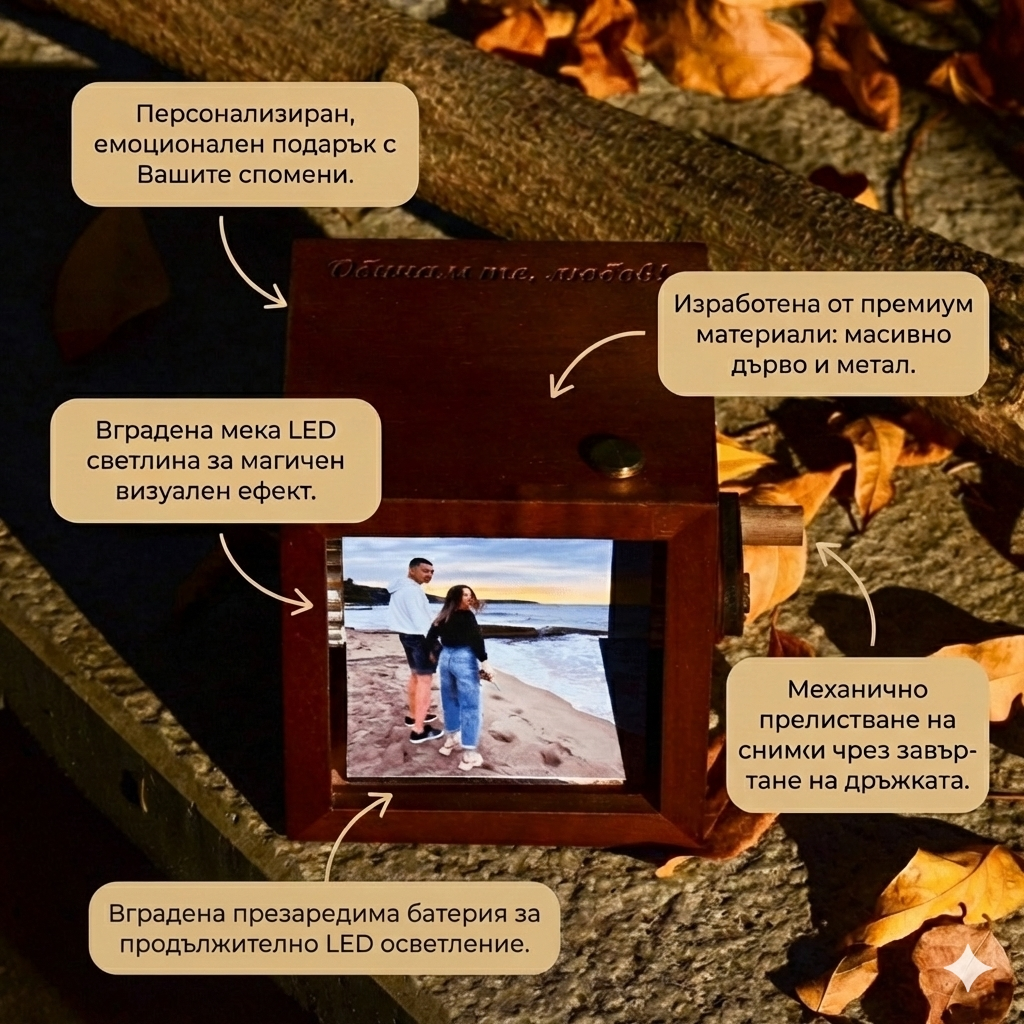 Идеална за годишнини, сватби или сантиментални изненади. Тази рамка е създадена за двойки, родители и приятели, които ценят смислените жестове. Тя е физическо доказателство за споделения път – подарък, който не събира прах на рафта, а кани всеки да завърти дръжката и да се усмихне отново.