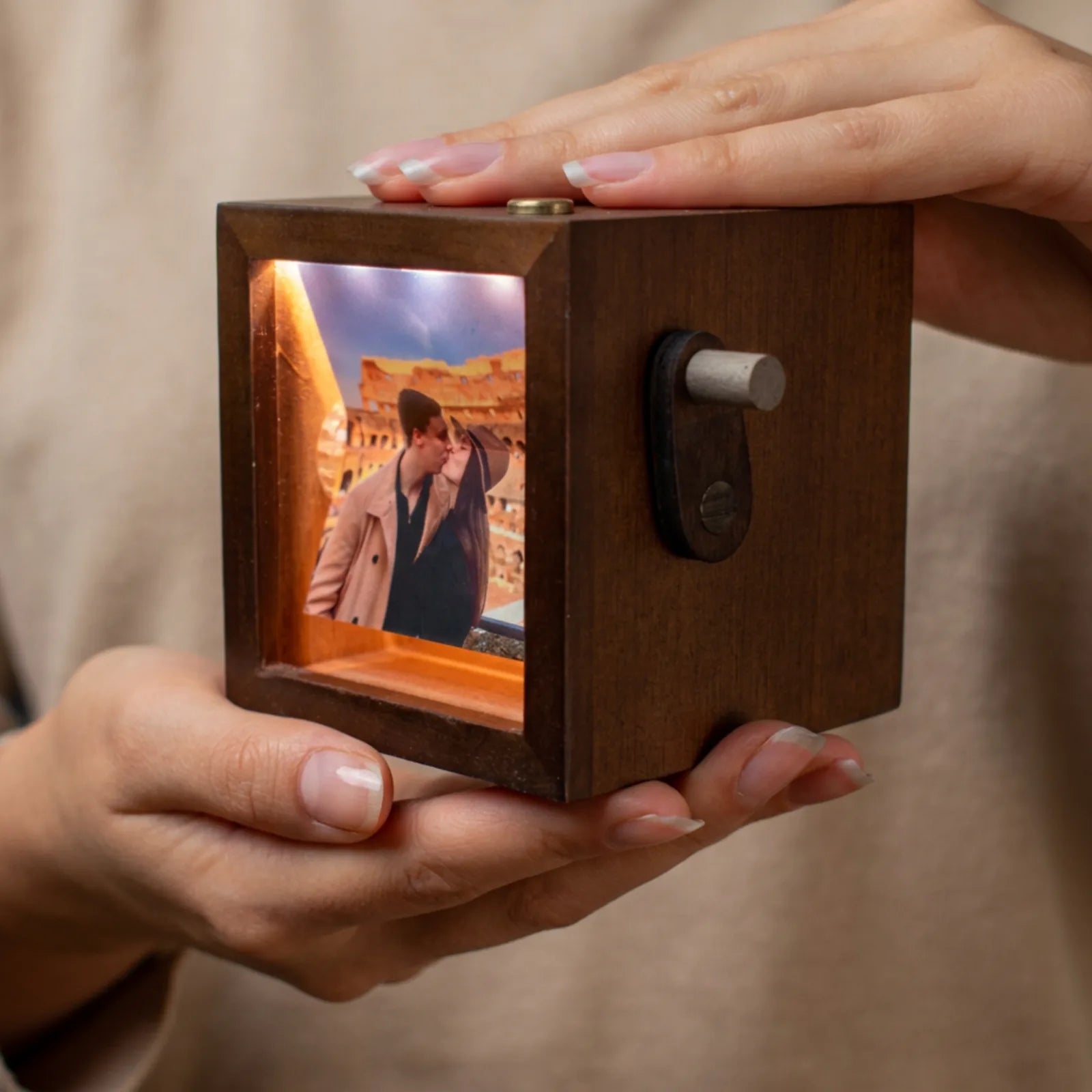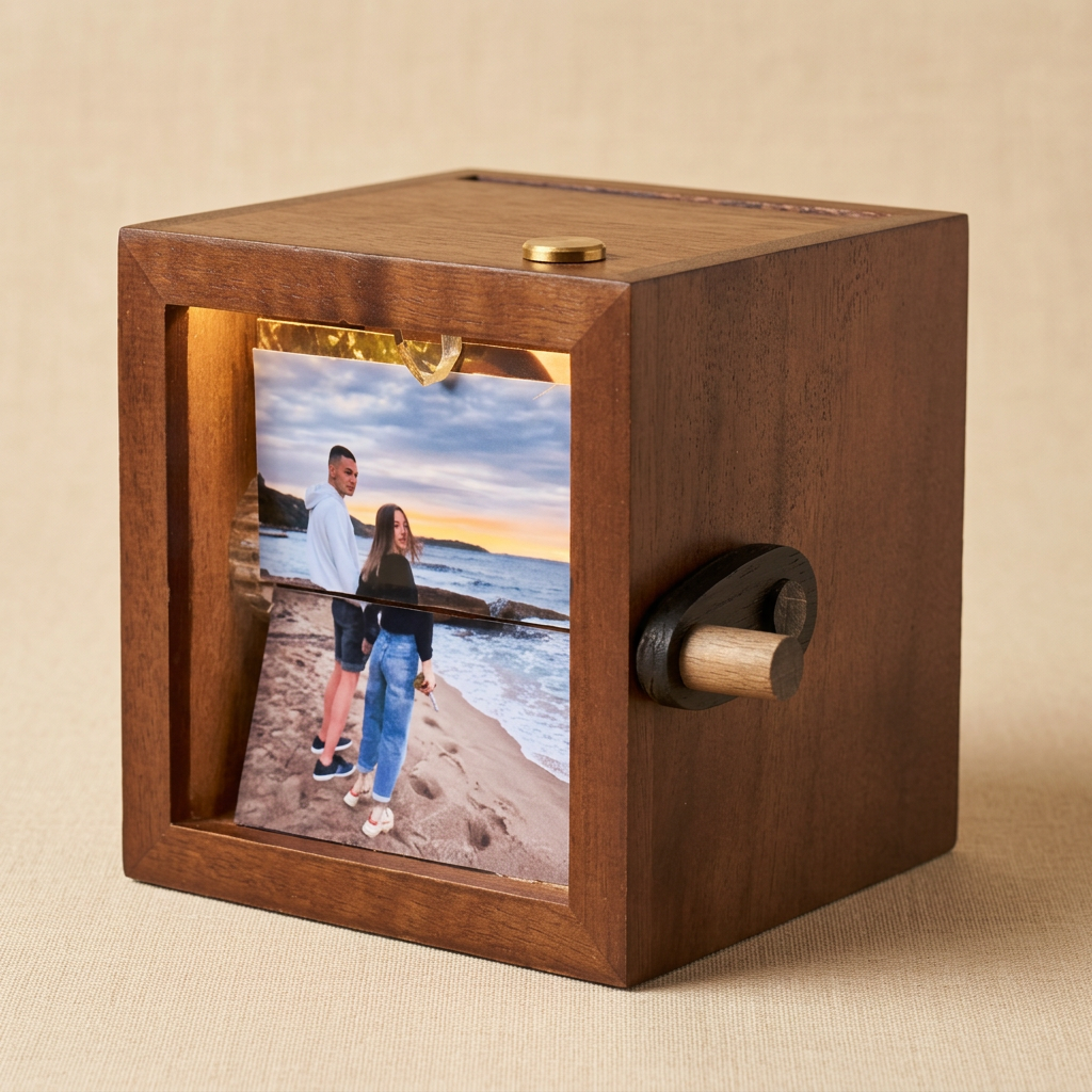 Виж, това е механична рамка за спомени, ане фитнес уред за предмишница. Ако решиш да тестваш колко оборота в секунда издържа, вероятно ще видиш как снимките ти отлитат в неизвестна посока. Върти плавно и със самочувствие, идеята е да изглеждаш романтично, а не като човек, който се опитва да запали стар дизелов двигател.