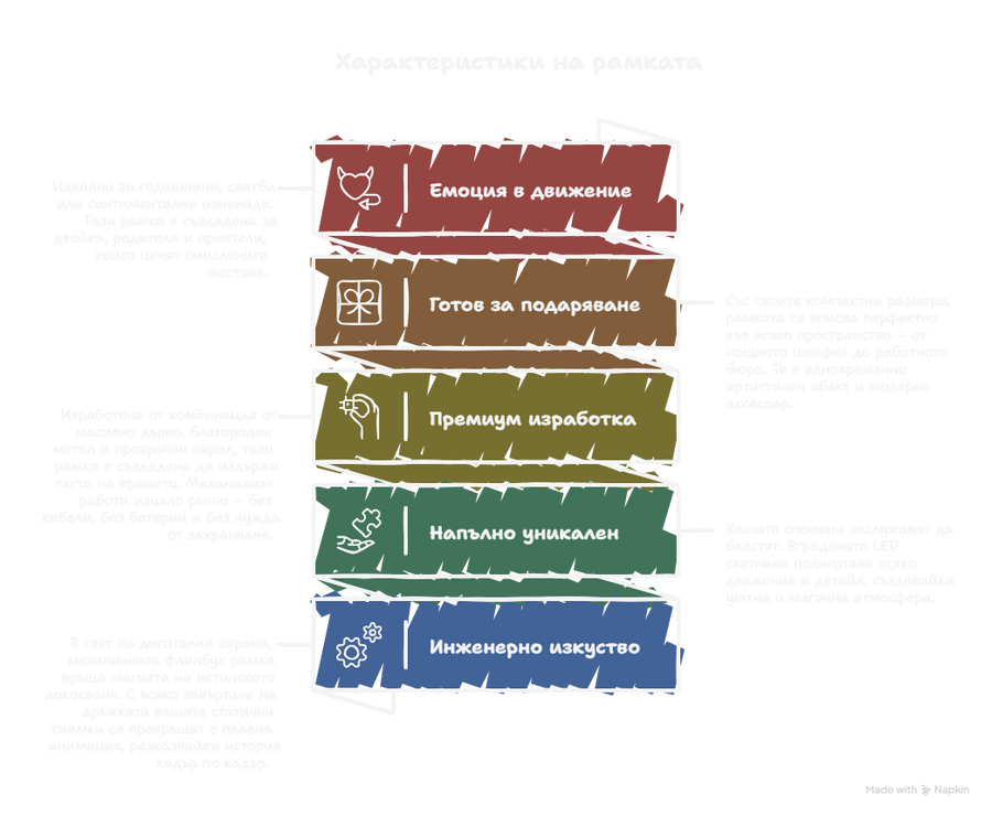 Всяка рамка е сглобена от масивно дърво и акрил с ината на човек, който не признава конвейера. Да, снимките отнемат време за залепяне. Да, Вие вероятно ще изпиете три кафета, докато напаснете всеки детайл на снимките, за да ви е мирна главата. Нали знаеш „Майсторът си личи по работата“, а не по рекламата. Когато усетиш тежестта в дланта си, ще разбереш, че това не е просто „рамка“, а малко инженерно чудо.