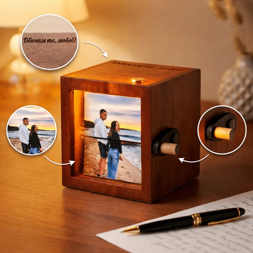 В свят, в който скролваме хиляди снимки на ден и не помним нито една, тази механична рамка е твоят неизбледняващ спомен. Тук няма екрани, няма нужда от ъпдейти и няма да ти излезе реклама по средата на спомена. С всяко завъртане на дръжката статичните кадри стават анимация. Нали знаеш – „Бързата работа срам за майстора“, затова тук всичко се случва с твоята скорост. Ти контролираш времето, поне за тези 16 снимки.