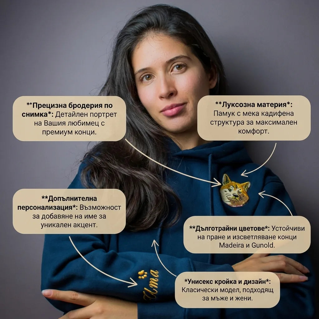 Твоят четириног приятел е част от семейството, а сега може да бъде част и от твоя стил. Ние превръщаме любимата ти снимка в прецизен бродиран портрет, който улавя характера на твоето куче или котка. Това не е просто суитшърт, а носима емоция – начин да покажеш на света онази специална връзка, която не се нуждае от думи.