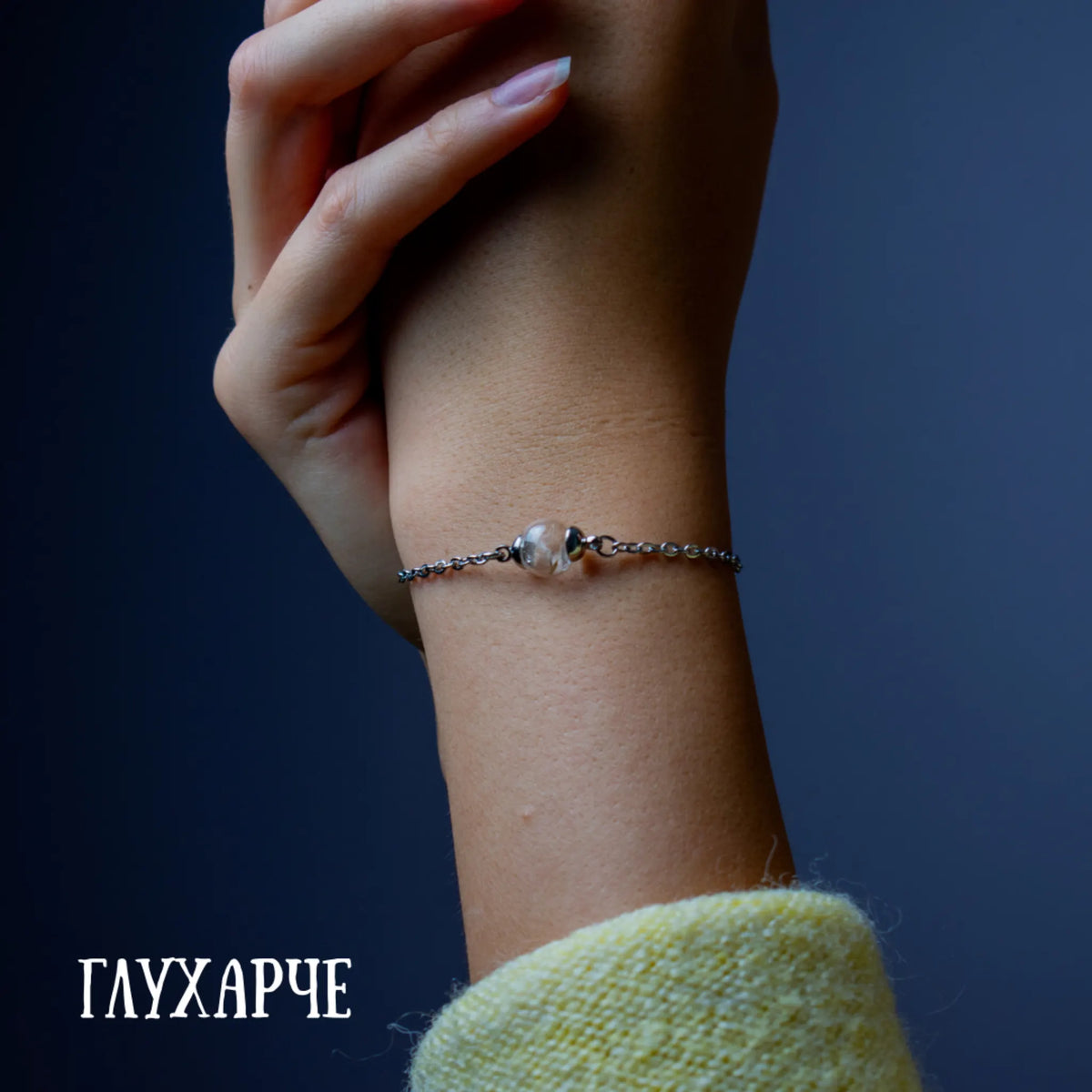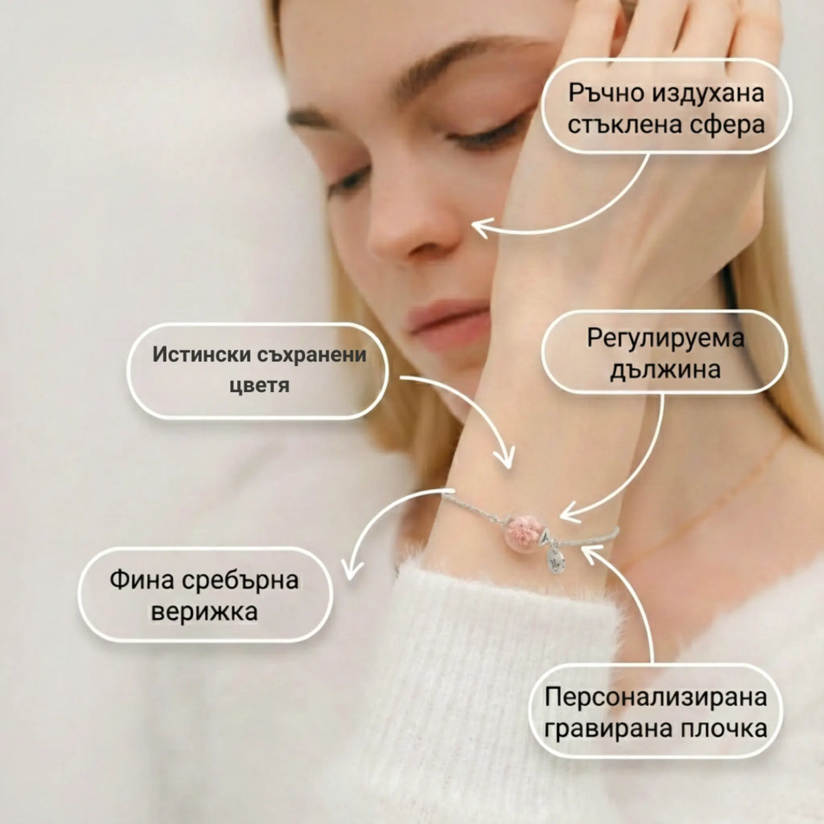 Създадохме тази гривна с мисъл за нежното дамско присъствие. Можете да избирате между благородно Сребро 925 или фин посребрен месинг. Ръчно духаното стъкло предпазва цветята, а регулируемата верижка гарантира, че бижуто ще прилепне идеално на всяка китка, носейки комфорт и лекота.