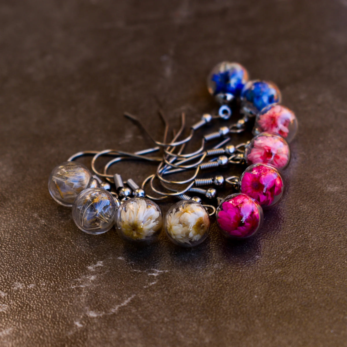 От нежно розово и страстно пурпурно до успокояващо синьо – изберете цвета, който резонира с вашата енергия. Всяко цвете е уникално по своята форма и нюанс, което гарантира, че вашите обеци ще бъдат единствени по рода си, точно както сте и вие.