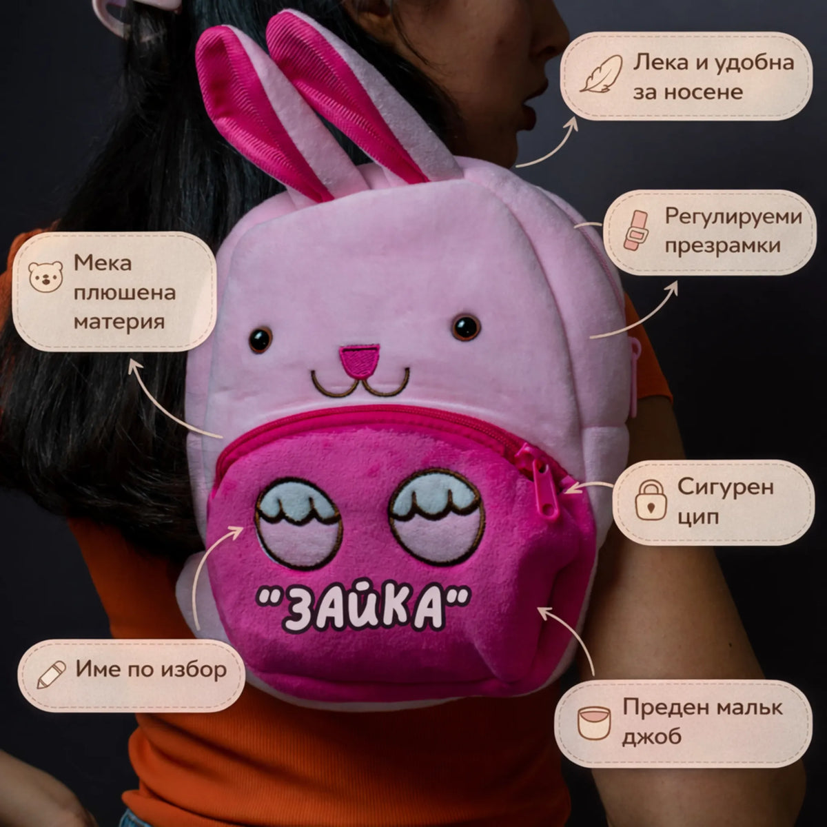 Детска Раница Зайче с Име – Бродирана Персонално, Мека и Удобна - Wishifyy