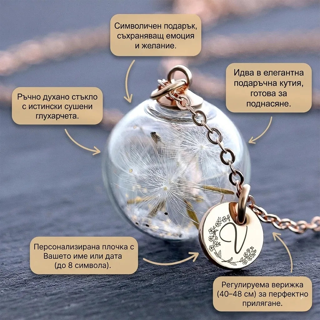 Всички сме духали глухарчета с надеждата, че вятърът ще сбъдне мечтите ни. В Wishifyy спряхме времето, за да уловим тези мигове. Колието „Направи Желание“ съхранява истински глухарчета в стъклена сфера – символ на вярата, че най-хубавото тепърва предстои. Подарете не просто бижу, а късче магия и надежда.