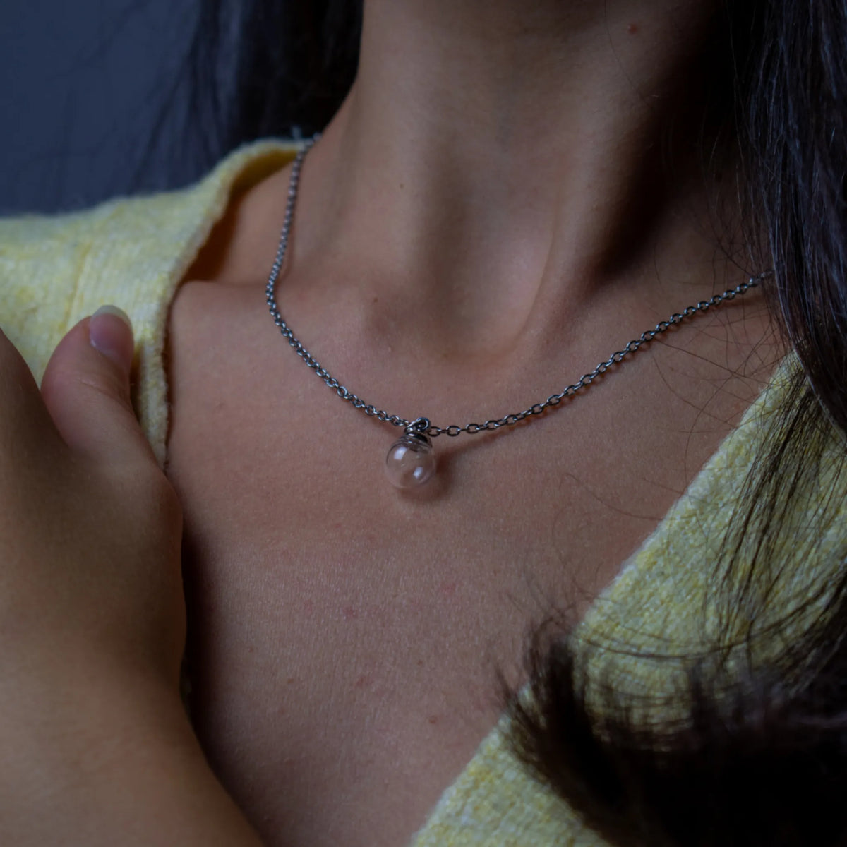 Всяка история заслужава име или дата. Малката плочка до стъкленото кълбо е вашето място за лично послание. Този деликатен акцент превръща колието от красиво украшение в личен символ на принадлежност. Това е „тихият“ глас на вашата обич, гравиран завинаги върху благороден метал.